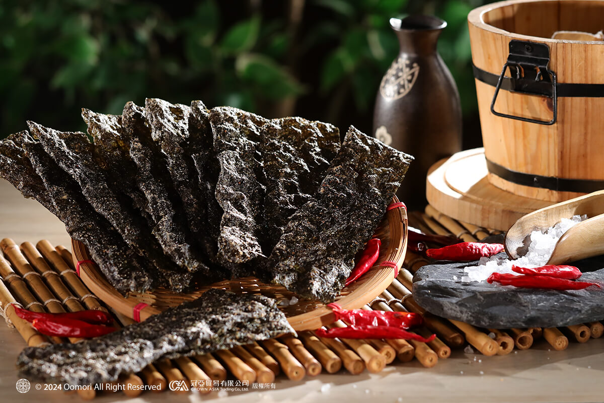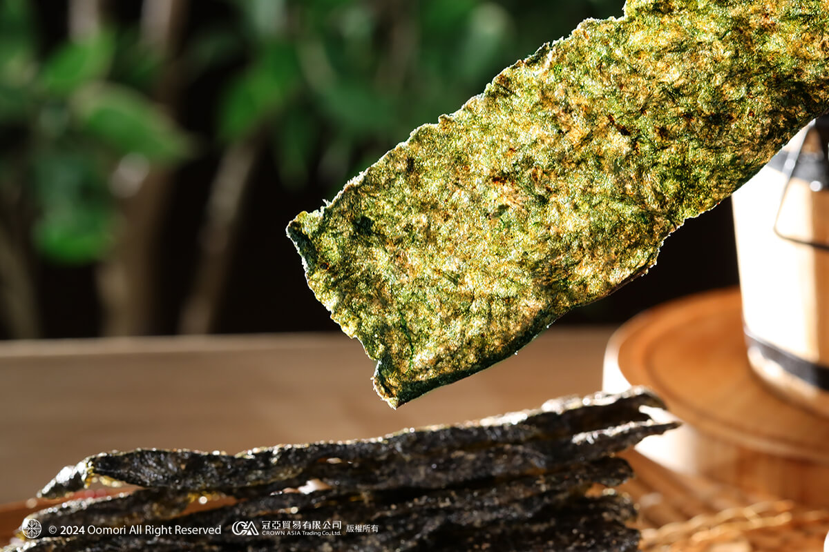 選用來自北緯33度日韓純淨海域的最高品質海苔嫩芽,在日本稱為「元揃海苔」。再以低溫烘焙技術純手工製作,酥脆度提升五倍以上。
