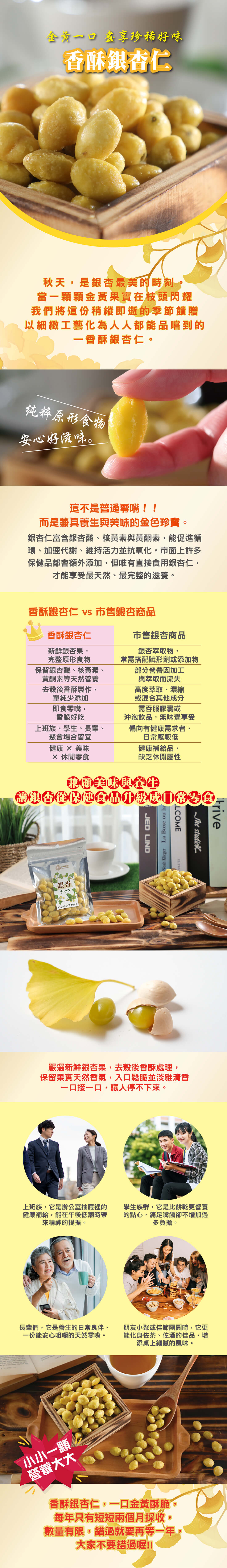 成份 | 銀杏仁(白果)、棕櫚油、食鹽、蔗糖素(甜味劑) |